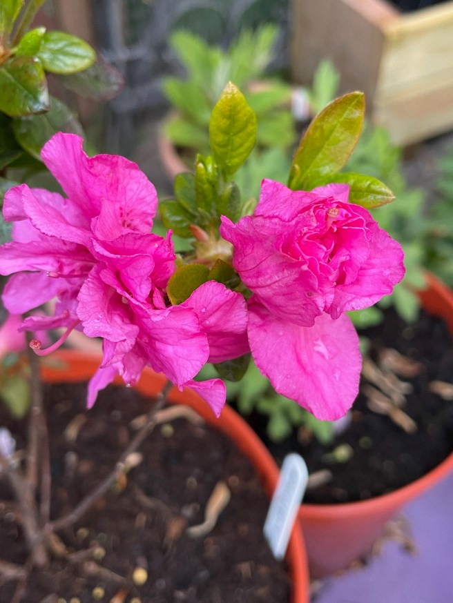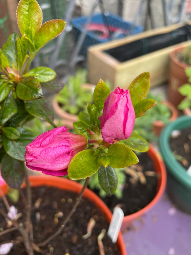 2. Azaleas. They are a bit of a mystery to me – I got this plant as a free gift when I bought some Cosmos last year and it did very little. This year it has burst out with these vivid pink flowers and I’m a little bewildered by them. They seem a little bit rose-like to me (I don’t like roses) but they don’t seem to have thorns so I can forgive them that resemblance. I fear that maybe I should have pruned them before they got to produce these flowers on the ends of very bare stems!