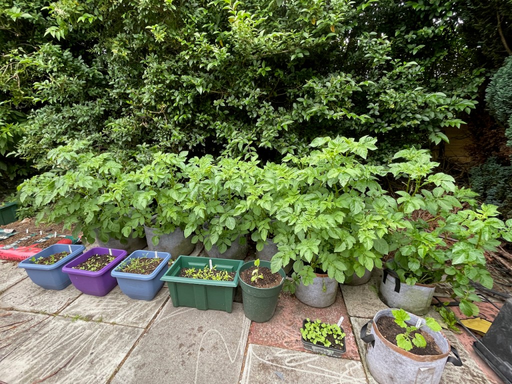 6. This last one is an area rather than an individual plant. Earlier in the year we cleared this area at the back of the garden and there’s much more space there now. I have put all the pots which the spring bulbs are still in and it’s great to have somewhere to leave them to die back on their own. It also meant I can have 6 or 7 pots of main crop potatoes (in the grey pots in the photo), I’ve also got some courgettes, radish, nigella, cosmos and zinnia. Just growing them on and will pot them up individually in the next month or so.