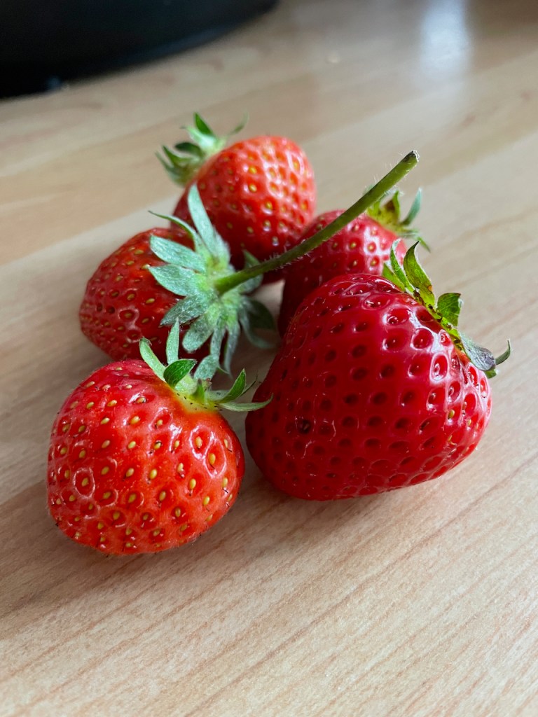 2. Strawberries. My first real haul of strawberries this year. The blackbirds are very interested so most of the big strawberries have been protected in little organza bags – seems to be working well so far, until the blackbirds work out how to open the bags I guess.