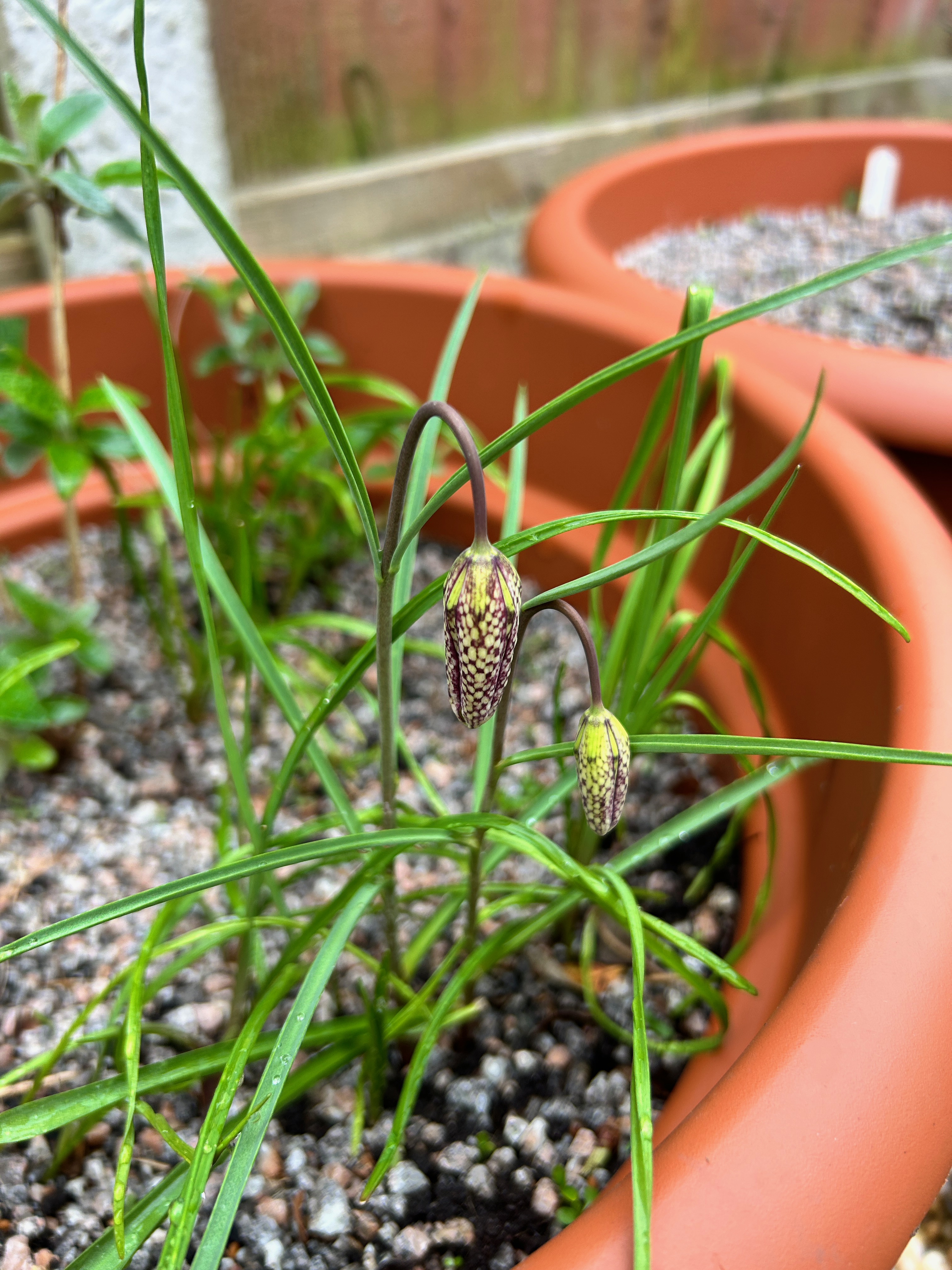 The snakeshead fritillary bulbs have made a reappearance and they are spectacular. Only four flowers so far but that’s three more than last year so I can’t complain.